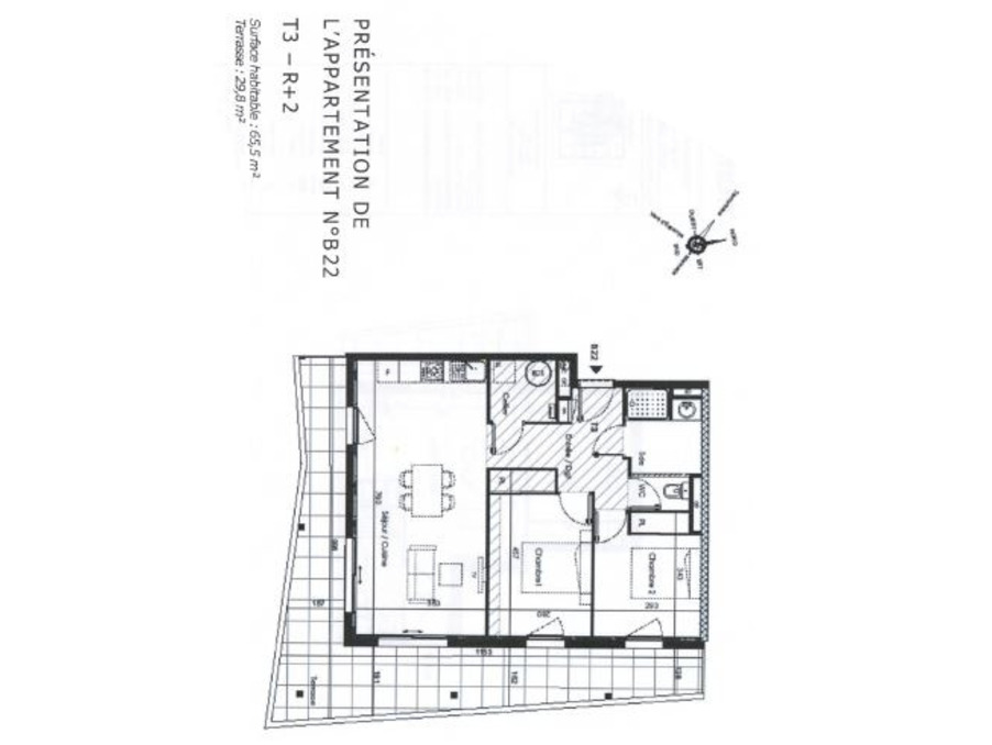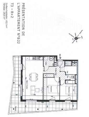 D'une surface de 65,5 m2, il se compose d'une pièce à vivre lumineuse, de deux chambres avec placards, toutes deux ouvrant sur une magnifique terrasse de 29,80 m2, d'un cellier pratique, ainsi que d'une salle d'eau fonctionnelle.