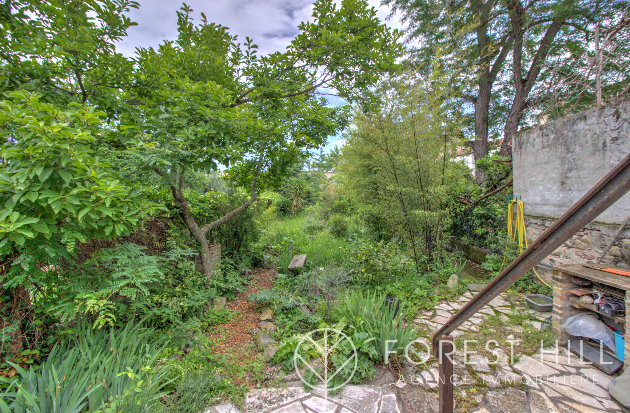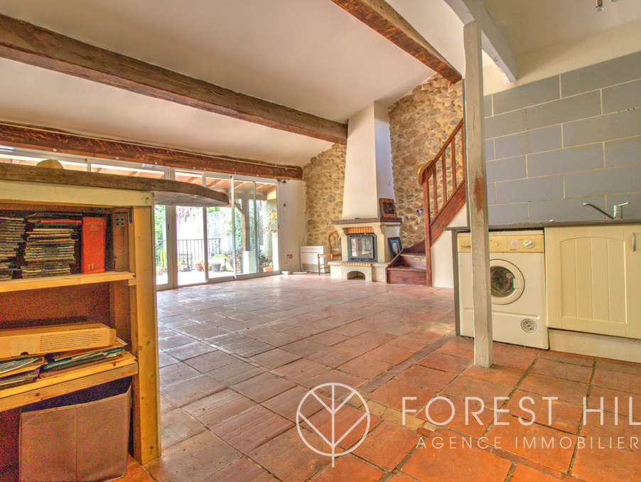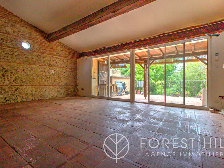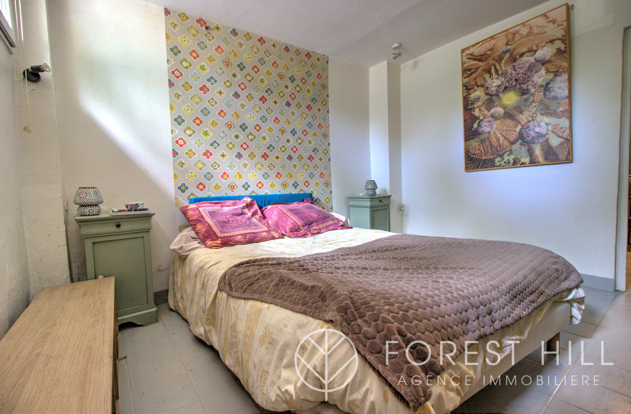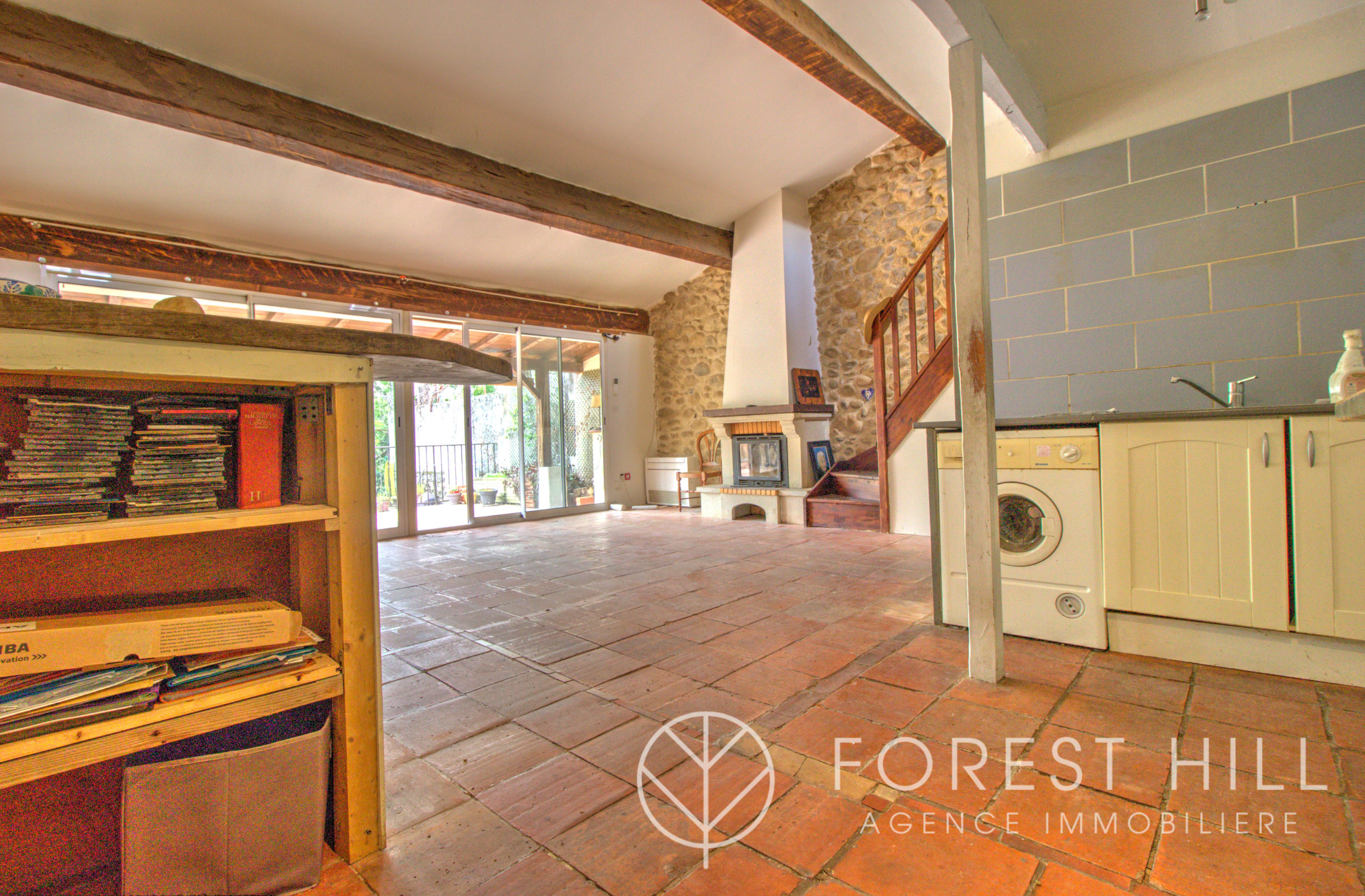 Le premier étage, accessible par une seconde entrée ou directement depuis le jardin, dispose d'une grande pièce de vie avec foyer fermé, d'une cuisine semi-ouverte, d'une seconde salle d'eau et d'une mezzanin. Les grandes baies vitrées donnent sur une belle terrasse, offrant une vue dégagée et apaisante sur le jardin.
