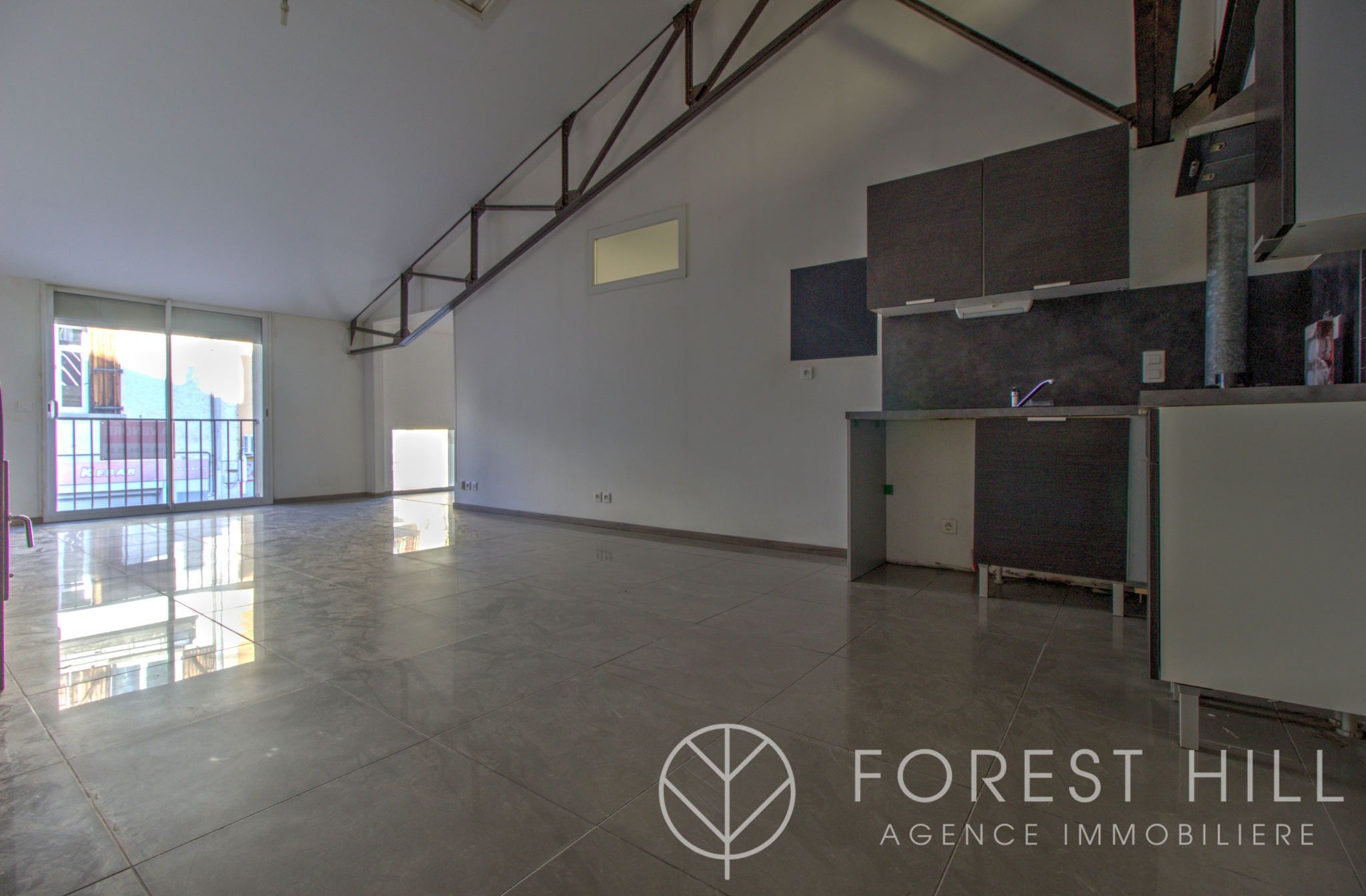 L'espace de vie principal, d'une superficie de plus de 45 m2, comprend une cuisine ouverte ainsi qu'un espace bureau, offrant confort et convivialité.