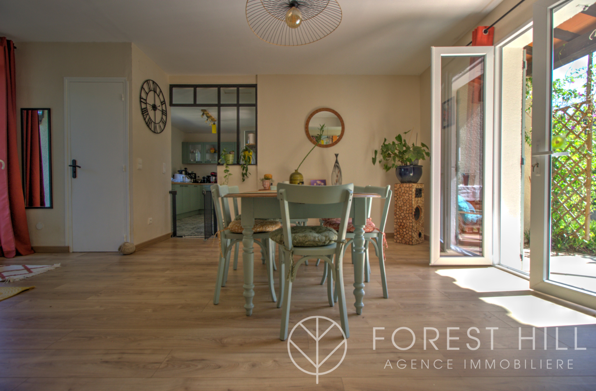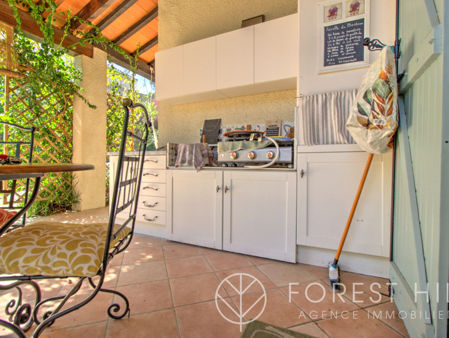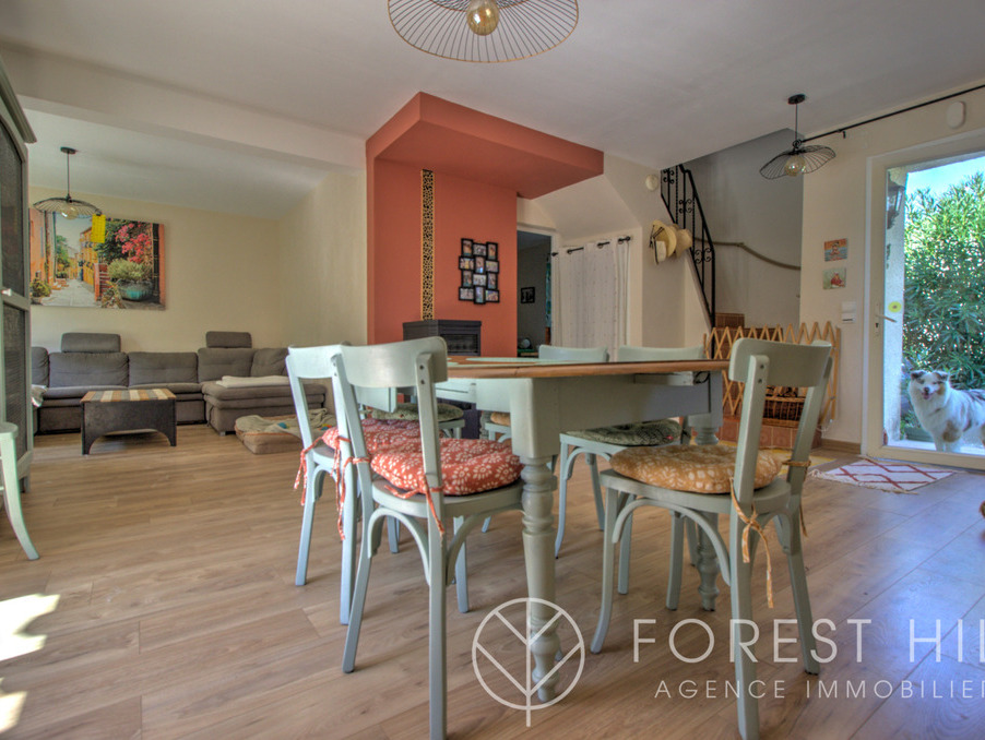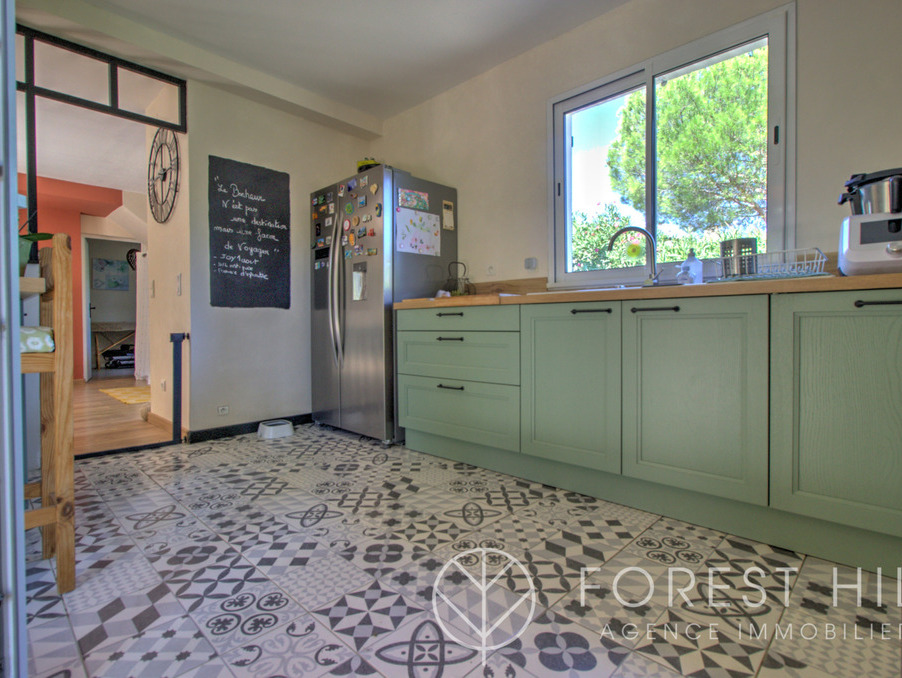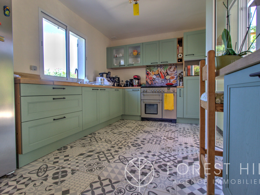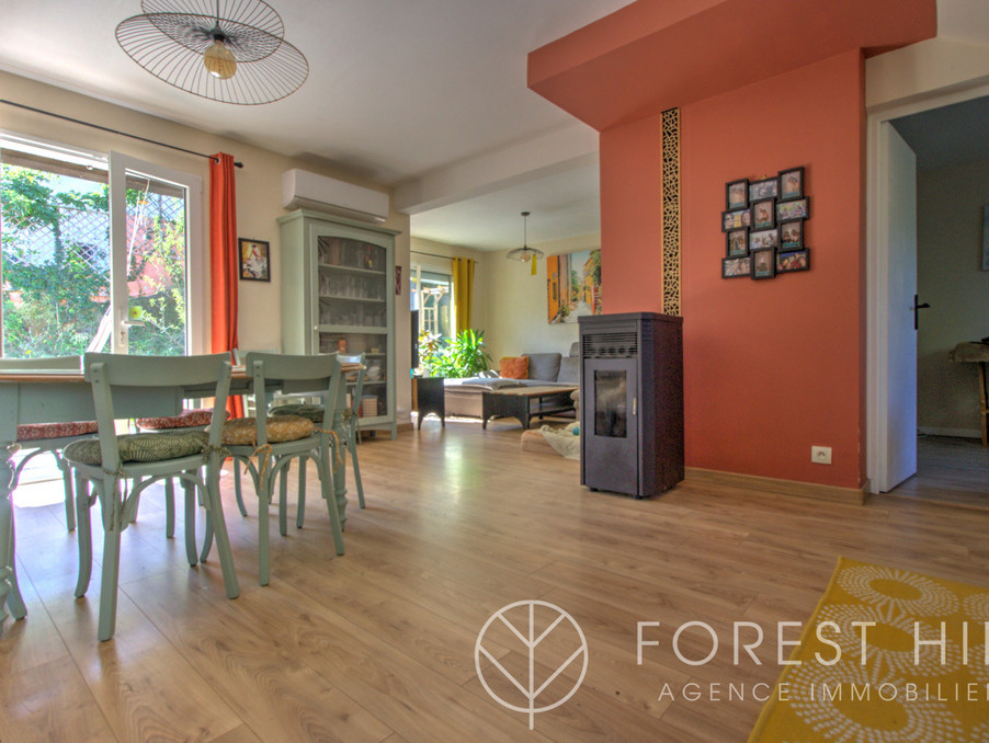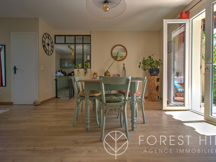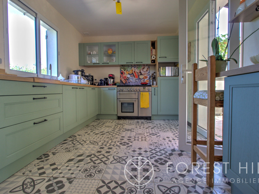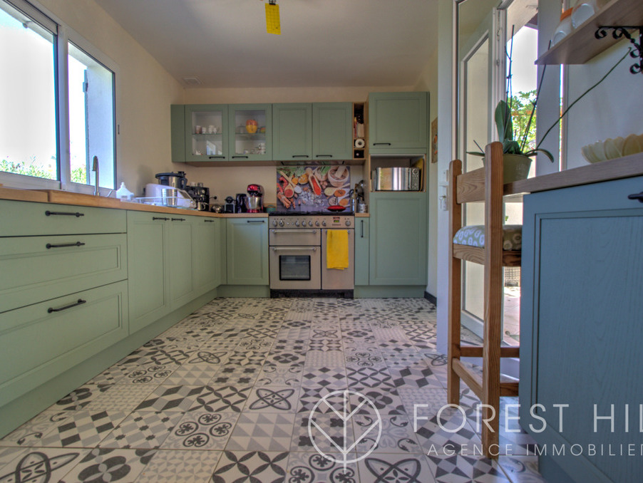 Située au calme, cette maison offre de beaux volumes avec une cuisine américaine récente et un salon-séjour lumineux donnant sur une terrasse avec cuisine d'été, ainsi qu'un jardin arboré.